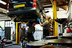ご来店にて受付 → メカニックが3人体制でお車を検査・分解点検 → 立会い説明(お車確認しながら、点検結果をご説明) → 組付・整備 → 完成検査 → 清算・お見送り